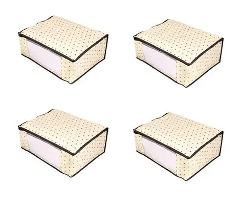 Non-Woven Fabric White Polka Dot Print Front Transparent Window Multi Purpose Clothing, Saree and Suit Storage Bag With Zip- Pack Of 4