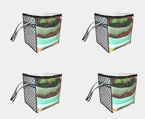Non-Woven Fabric White Polka Dot Print Front Transparent Window Multi Purpose Clothing, Saree and Suit Storage Bag With Zip- Pack Of 4